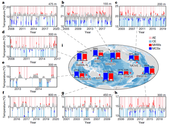 该研究分析了位于全球不同海盆、最长观测时间超过15年的8套长期潜标资料,发现了超过80%的次表层热浪/冷浪事件与表层热浪/冷浪没有直接关联。它们之中约有一半发生于反气旋涡/气旋涡经过期间。这一比例高于对应涡旋的发生频率,且强度越大的事件发生于涡内的比例越高。这表明,与海气热交换等表层极端事件的主导机制不同,涡旋在驱动次表层热浪/冷浪中起到关键作用。