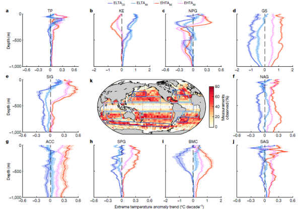 近几十年来,由于温室气体持续排放,全球海洋经历了明显变暖。为了探讨次表层热浪/冷浪的响应,该团队估算了1993年至2019年10个不同动力海区的涡内与背景极端温度异常的线性趋势,发现了涡旋有助于放大全球海洋中热浪的升温速率和冷浪的降温速率。初步分析显示,海洋变暖引发的涡旋增强的作用高于垂向层化增强,这是涡旋放大效应的主导机制。