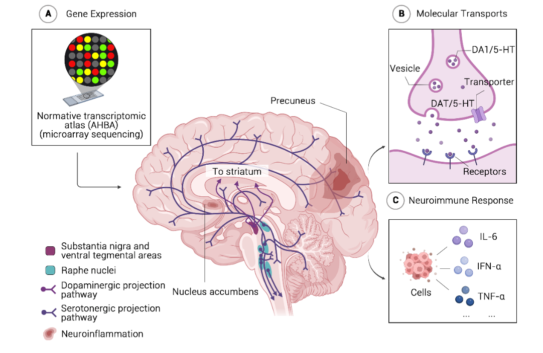 研究进一步采用被试间表征相似性分析,生成病理性拖延的全脑影像表征。结果显示,病理性拖延的影像表征主要定位在默认模式网络,并在大脑空间分布上,与皮层功能梯度以及调控动机与奖励的关键神经递质系统高度重合。随后,研究人员对该全脑影像表征与人脑基因表达数据进行了横断面与纵向的转录组整合分析。结果显示,该全脑影像表征与分子运输过程、神经免疫反应及神经炎症明显相关,并指向血清素、多巴胺通路功能失调。