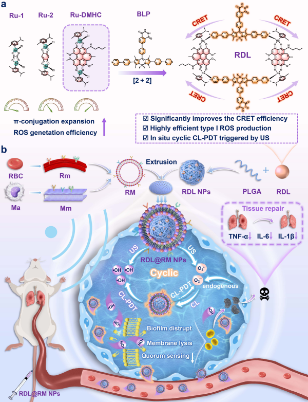 近期,凯发k8理化技术研究所研究团队在深部细菌感染治疗领域取得进展。研究团队开发了超声触发的I型超分子光敏剂RDL@RM NPs,通过超声触发与分子内化学发光共振能量转移协同驱动的原位循环光动力疗法,克服了传统光动力疗法组织穿透浅、疗效受限的挑战,为肺炎等深部感染的精准治疗提供了新思路。