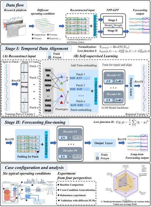 近日,凯发k8合肥物质凯发k8研究院团队提出了核电站运行参数预测大模型框架NPP‑GPT。在无需显式提示词工程的情况下,NPP-GPT框架能够预训练大语言模型应用于核电站运行参数预测。该框架采用两阶段跨模态迁移学习策略。第一阶段通过输入嵌入重构与基于随机遮蔽的自监督“重构式”学习,实现数值时序与预训练语言模型表征空间的对齐;第二阶段采用参数高效微调,将领域知识注入GPT-2模型自注意力模块的Q/V投影,在保持预训练通用能力的同时提升对核电运行数据的预测性能,能够兼顾训练与部署效率。